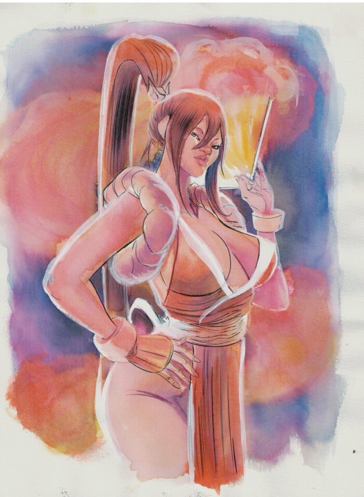 This 11×14 original captures Mai Shiranui at her most iconic — confident, playful, and dangerous in equal measure. Loose watercolor blooms create heat and atmosphere, while crisp Copic ink lines lock in her form, movement, and unmistakable attitude. The result is all tension and allure, balanced between grace and combustion.
