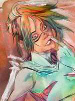 This original watercolor captures that volatile in-between moment the split second where sweetness tilts into danger. Loose washes of neon mint, hot coral, and bruised violet collide under sharp, expressive line work, creating a portrait that feels alive and unpredictable.