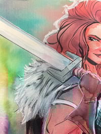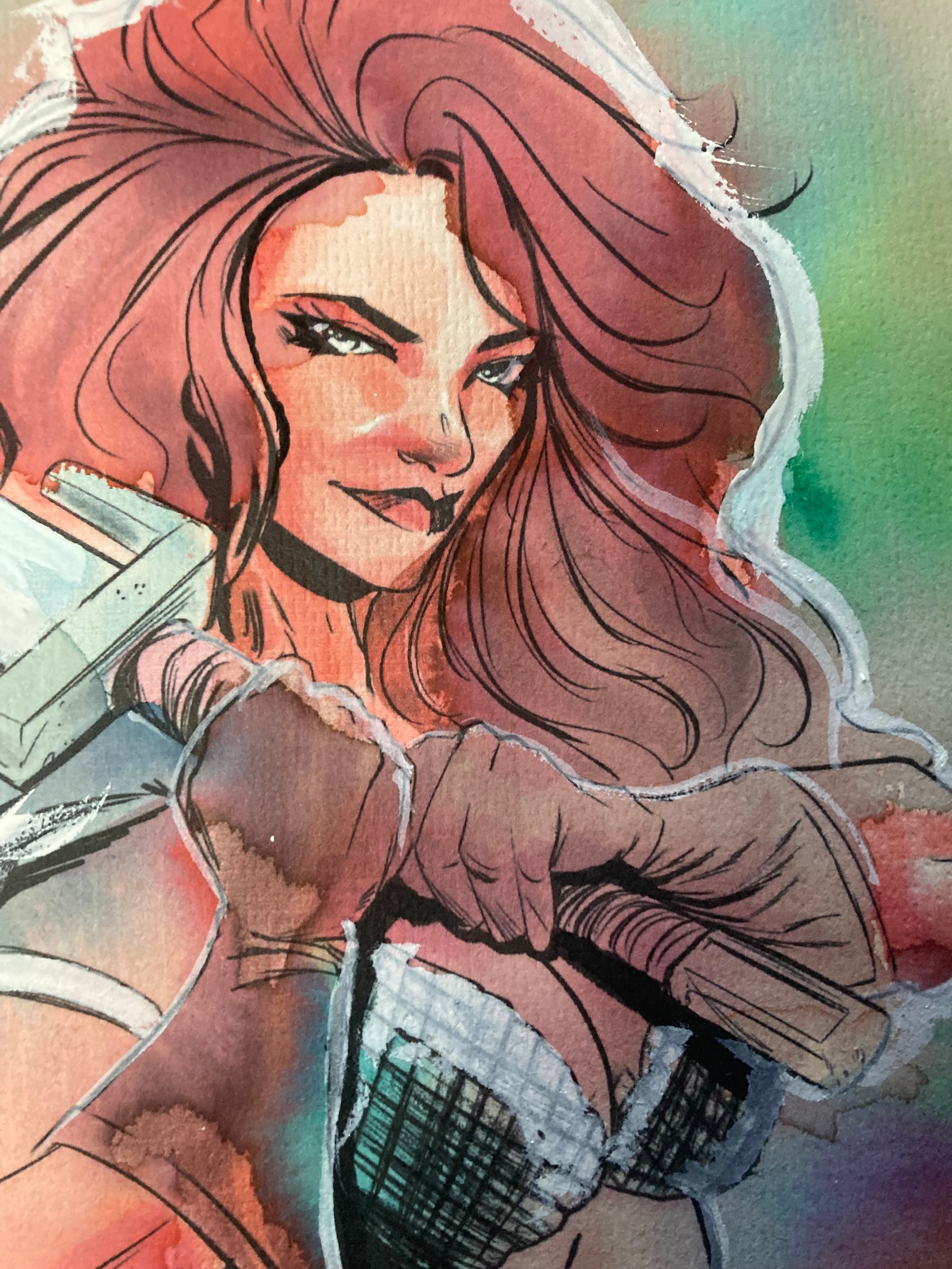 A fierce original of the She-Devil with a Sword — Red Sonja. Painted with watercolor and acrylic on cotton watercolor paper, this 11x14 inch piece channels raw strength, bold color, and that unmistakable fire Sonja brings to the page.