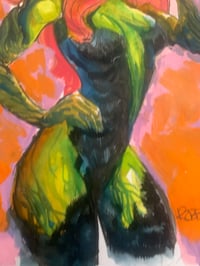 This one-of-a-kind hand-painted piece explodes off a Batman #50 blank variant cover, transforming it into a vivid celebration of strength, sensuality, and style. Rendered in a dynamic mix of ink, watercolor, and acrylic ink, the artwork radiates with saturated neon greens, burning oranges, and electric violets. The figure’s confident pose and arresting palette channel a raw, almost mythic energy—equal parts femme fatale and force of nature.