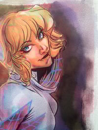 Spider-Gwen, with that over-the-shoulder glance that cuts right through the multiverse. Painted on 11x14” heavyweight watercolor paper using a mix of ink, watercolor, and experimental acrylic ink. The brushwork leans soft here—ghostly tones and saturated shadows built on instinct and mood. I’m still pushing the limits of acrylic ink and letting the medium guide the vibe.